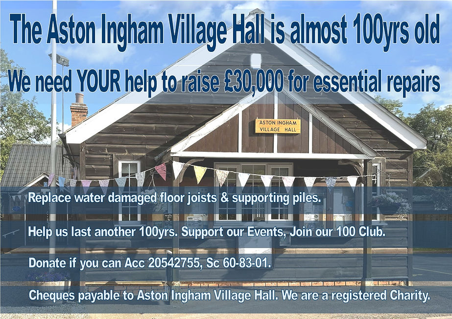 To hire Aston Ingham Village Hall, contact Sue Harding Contact Details on PDF copy on Home Page