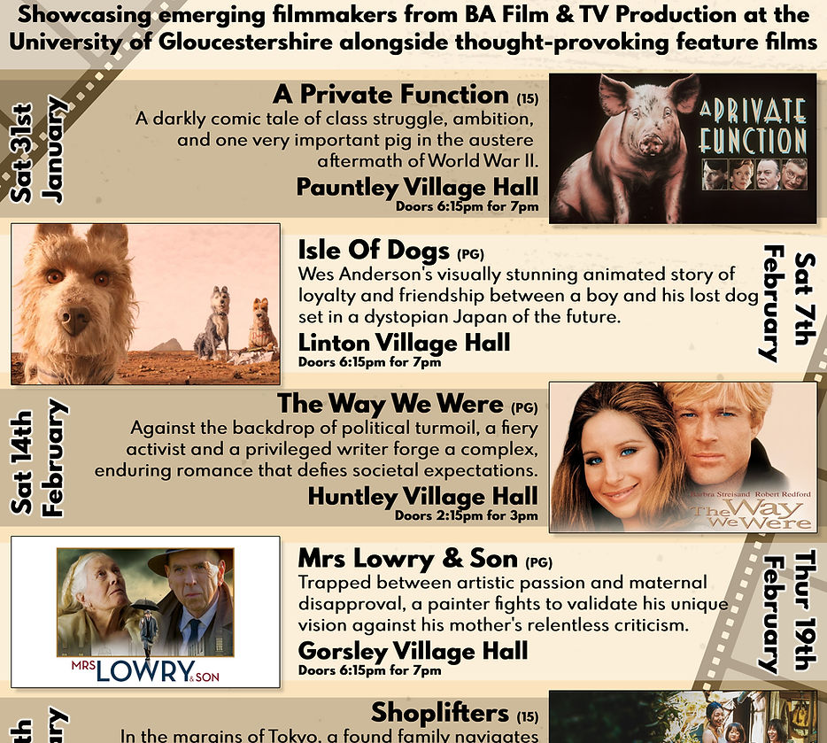 As mentioned in previous Chimes, we are taking part in the first “Five Villages Film Festival” along with four other village halls. Together with Gorsley Village Hall, we will be crossing the border into the uncharted territories of Gloucestershire, including Pauntley, Huntley and Cliffords Mesne…